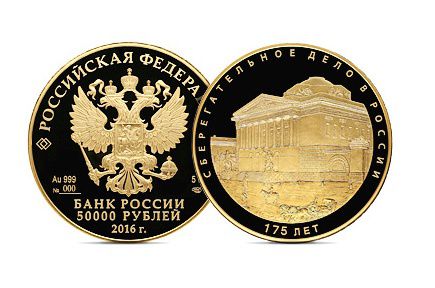 Банк России выпускает в обращение пять памятных монет из драгоценных металлов «175-летие сберегательного дела в России»: 27 октября — серебряную номиналом 3 рубля и золотую номиналом 50 рублей, 1 декабря 2016 года — серебряную номиналом 100 рублей и золотые номиналом 10 тыс. и 50 тыс. рублей.